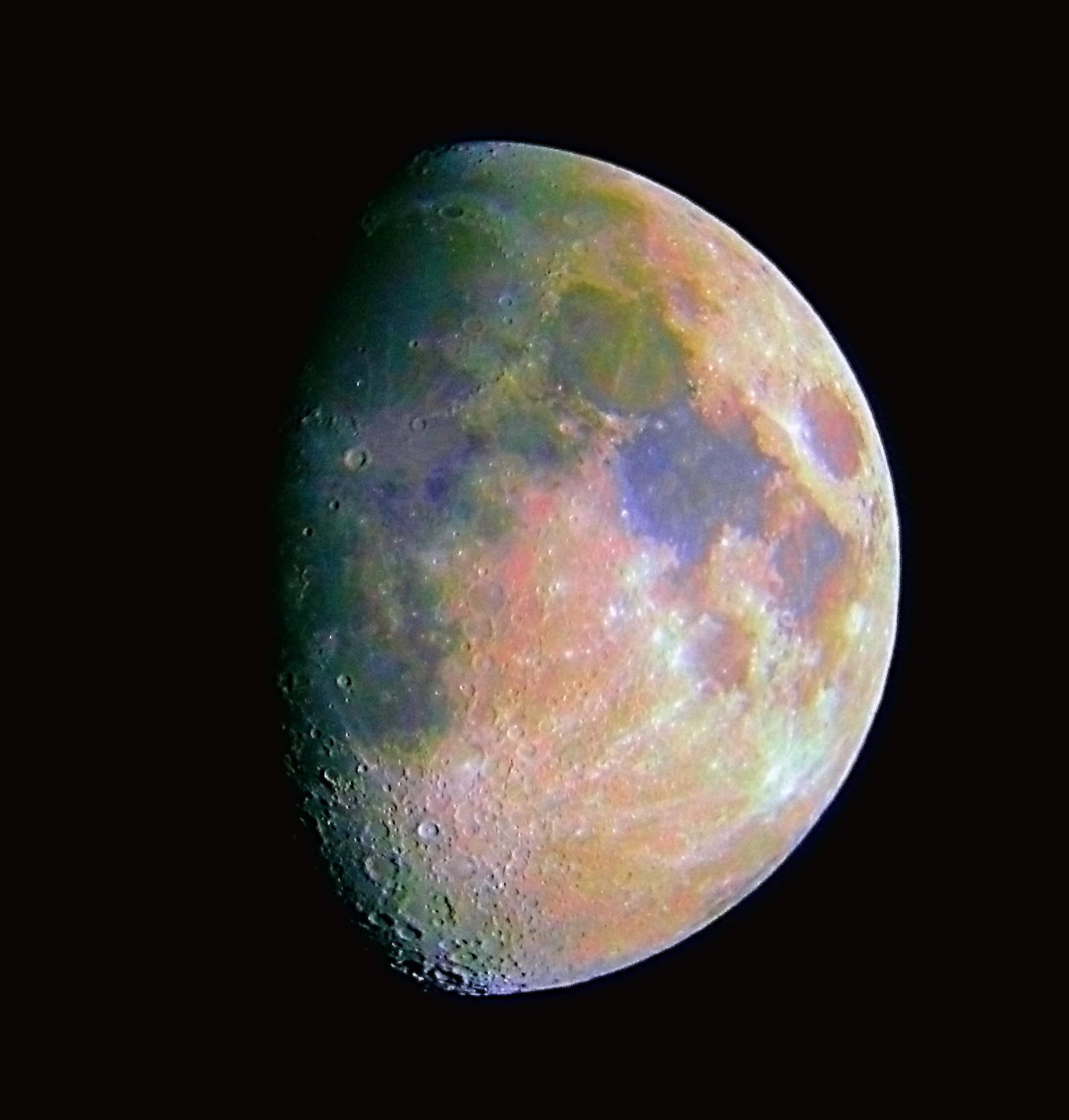 False colour processed image of the moon (increased saturation).Although we think of the moon as being monochromatic, the irregular distribution of metals in the moon's basalt plains (seas) gives some variations in colour across the moon's surface. Sinus Medii (left, middle) is visible clearly as dark violet. Mare Tranquillitatis is similarly dark blue/purple. This shows higher concentrations of Titanium and Iron, making these basalt areas known as "metal rich basalts". The orange areas are highlands which are metal poor. As the basalt areas were formed by ancient volcanoes, I suppose their composition gives us some insight into what lies below the moon's surface (or did). |