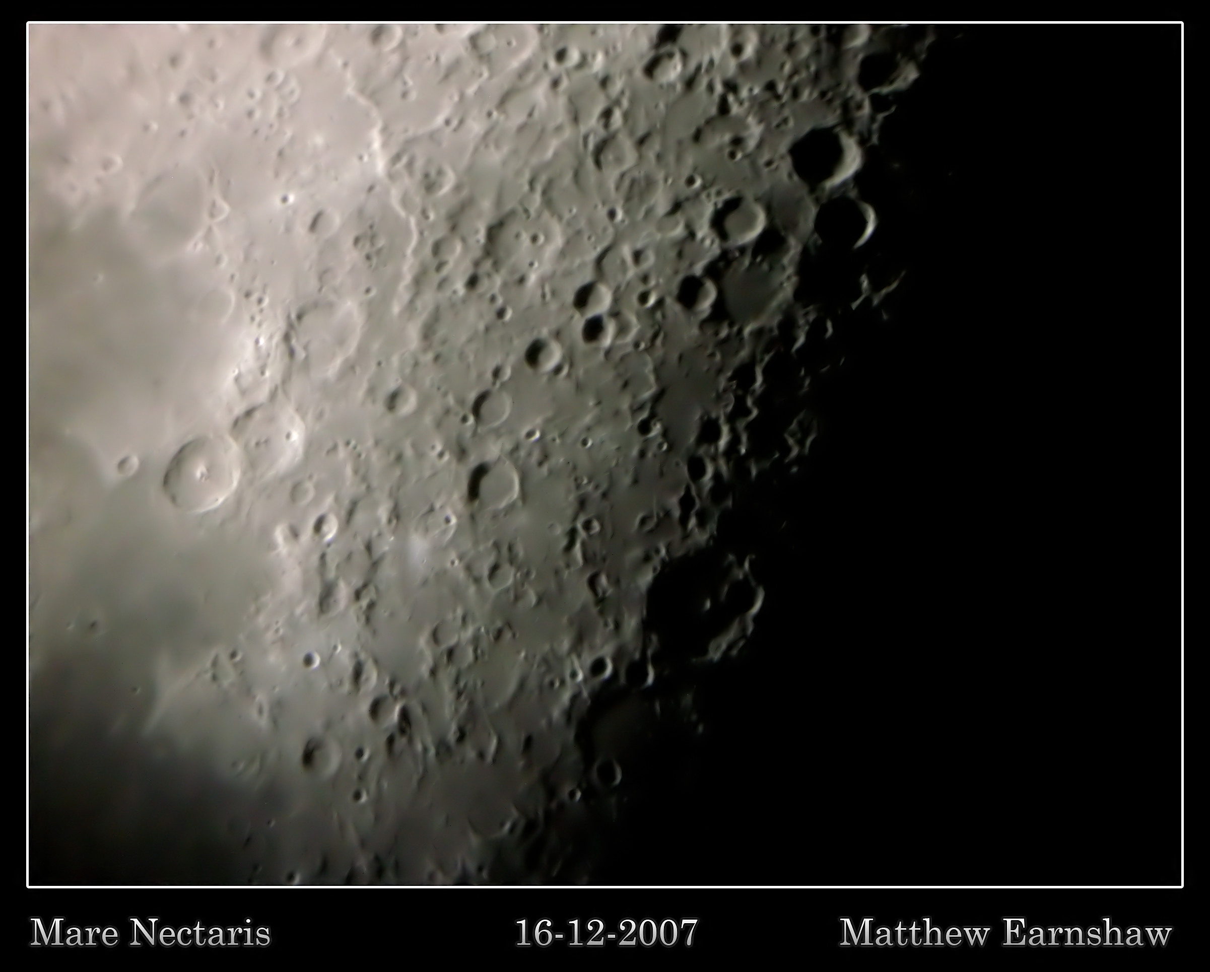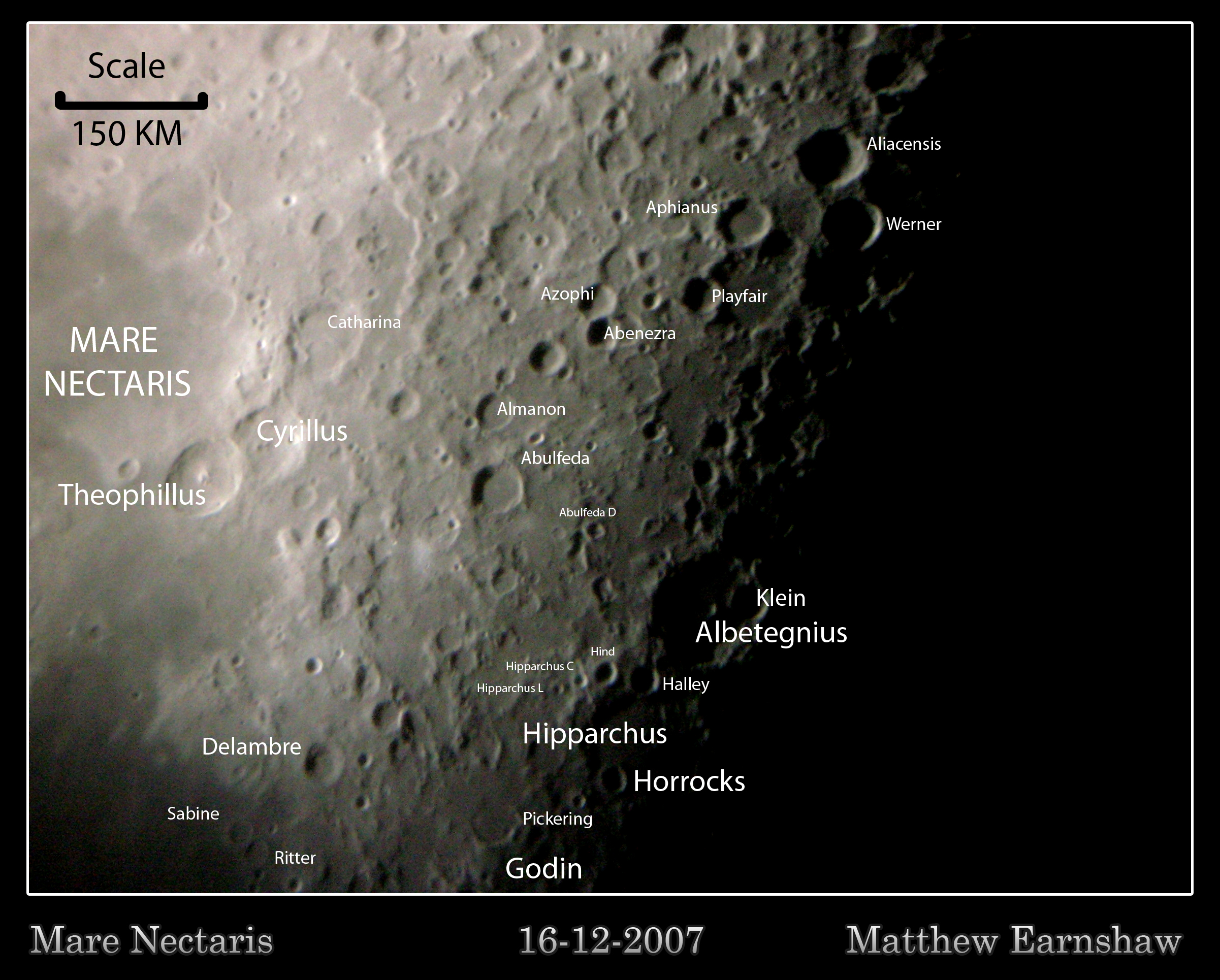 Mare Nectaris: At 101,000 sq km, Mare Nectaris is one of the smaller lunar 'seas'. A lunar 'sea' is actually a dark iron rich volcanic plain.